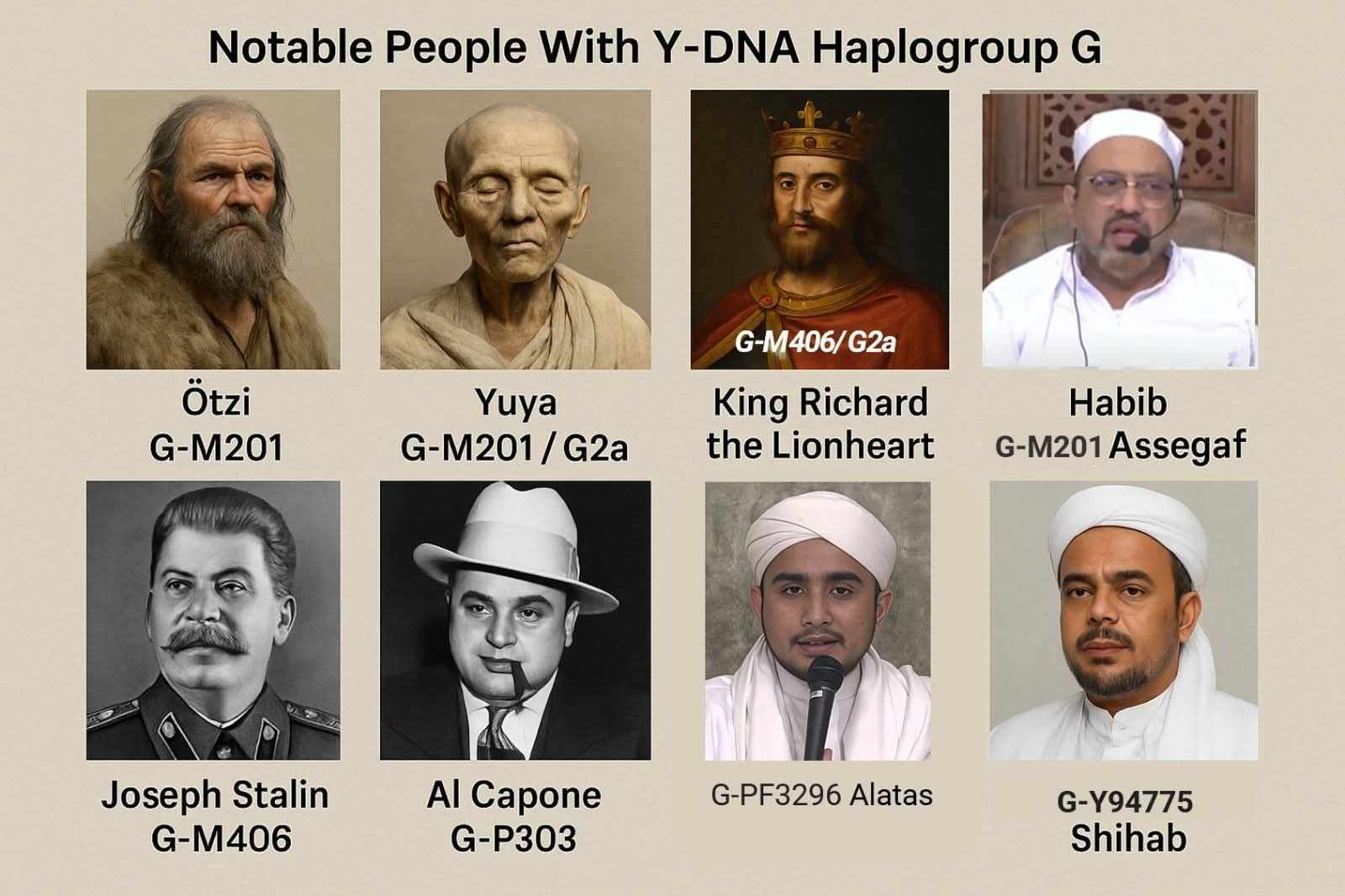 Sampel Kunci: Mumi Yuya (G2a), Joseph Stalin (G2a1a1), dan mayoritas klan Ba’alwi (G2a).