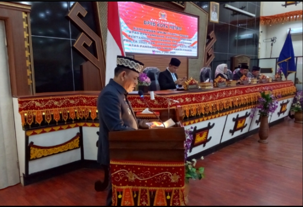SuaraJurnalis, Lampung (Kota Metro)- Wali Kota Metro, Bambang Iman Santoso menyampaikan Terimakasih atas pandangan Fraksi fraksi DPRD Kota Metro. Ia dan OPD serta stakeholder, berkomitmen mewujudkan pengelolaan PAD yang lebih baik lagi ke depannya. Hal itu, disampaikan Wali Kota Metro H.Bambang dalam agenda pandangan umum fraksi yang digelar di ruang sidang utama, DPRD Metro, Senin (07/07/2025).