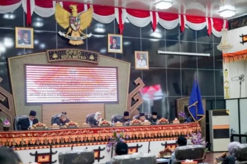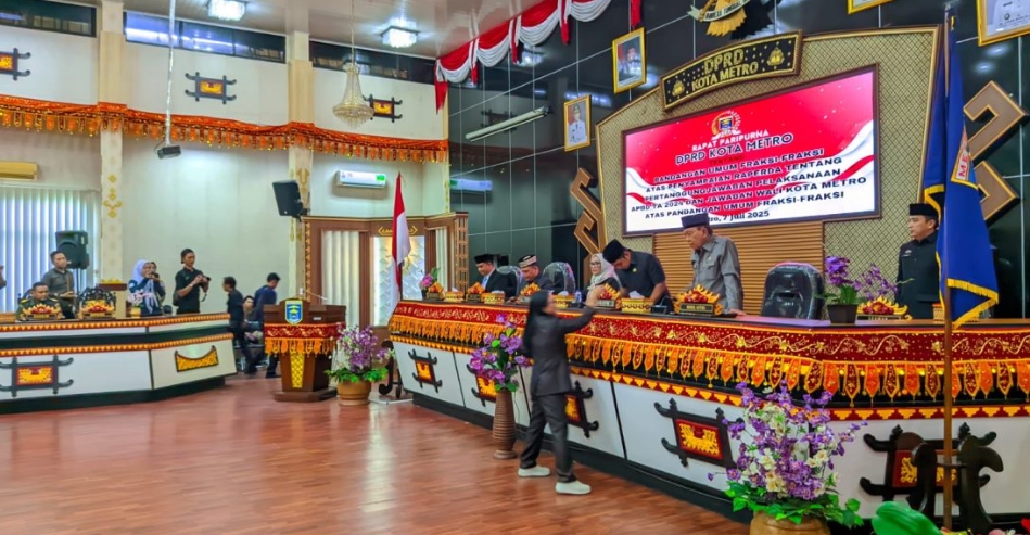 Dalam Rapat Paripurna DPRD Kota Metro tentang Laporan Keterangan Pertanggungjawaban (LKPJ) APBD Tahun Anggaran 2024, Wali Kota Metro, Bambang Iman Santoso, didampingi Wakil Wali Kota Metro, M. Rafieq Adi Pradana.