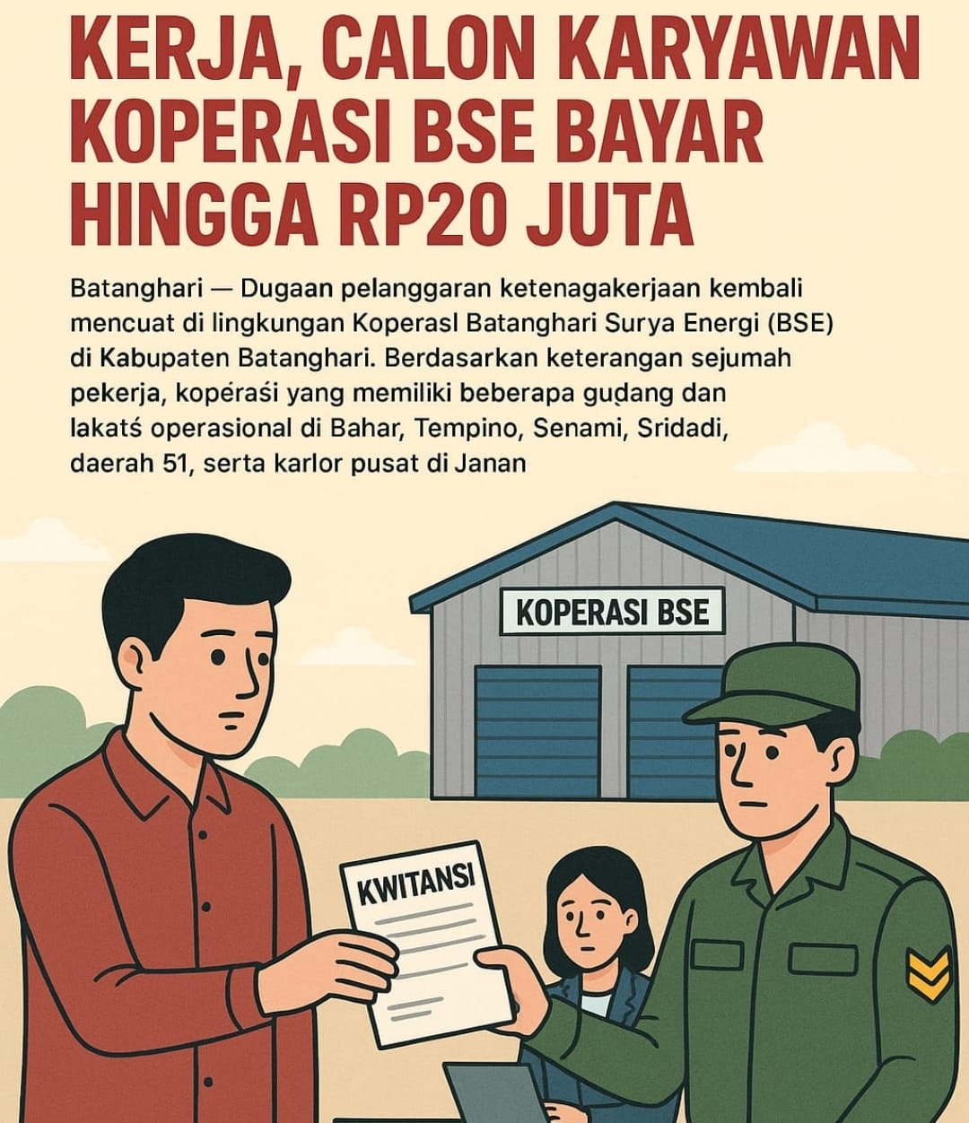 Batanghari —suarajurnalis.online Dugaan pelanggaran ketenagakerjaan kembali mencuat di lingkungan Koperasi Batanghari Surya Energi (BSE) di Kabupaten Batanghari. Berdasarkan keterangan sejumlah pekerja, koperasi yang memiliki beberapa gudang dan lokasi operasional di Bahar, Tempino, Senami, Sridadi, daerah 51, serta kantor pusat di Jalan Putri Pinang Masak, Bulian, diduga telah mempekerjakan ratusan karyawan tanpa pemberian gaji selama berbulan-bulan.