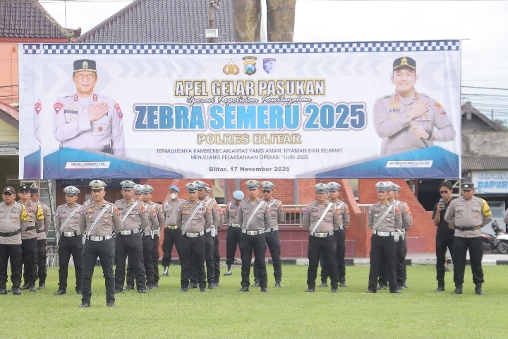 Blitar – Polres Blitar menggelar Apel Gelar Pasukan Operasi Zebra Semeru 2025 yang menandai dimulainya operasi kepolisian selama 14 hari, mulai 17 hingga 30 November 2025. Apel ini melibatkan TNI, Pemerintah Daerah, serta berbagai stakeholder sebagai bentuk sinergi menjaga keamanan dan ketertiban lalu lintas di Kabupaten Blitar, Senin (17/11/2025).