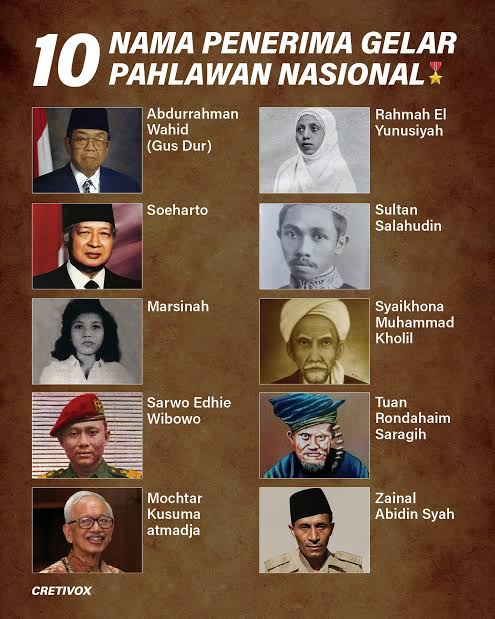 Presiden Prabowo secara resmi menganugerahkan gelar Pahlawan Nasional kepada sepuluh tokoh, yaitu: