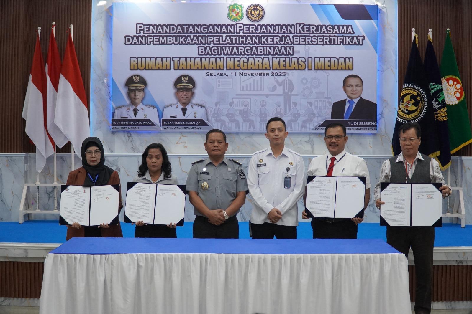 MedanSuaraJurnalis:Rumah Tahanan Negara (Rutan) Kelas I Medan resmi menjalin kerja sama strategis dengan Dinas Ketenagakerjaan (Disnaker) Pemerintah Kota Medan serta empat Lembaga Bantuan Hukum (LBH) melalui kegiatan Penandatanganan Perjanjian Kerja Sama dan Pembukaan Pelatihan Kerja Bersertifikat bagi warga binaan yang digelar pada Selasa, (11/11/2025). Kolaborasi ini merupakan langkah nyata Rutan Medan dalam meningkatkan kualitas layanan pembinaan serta pemenuhan hak-hak warga binaan.